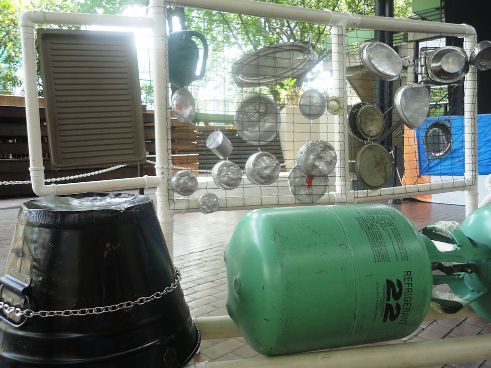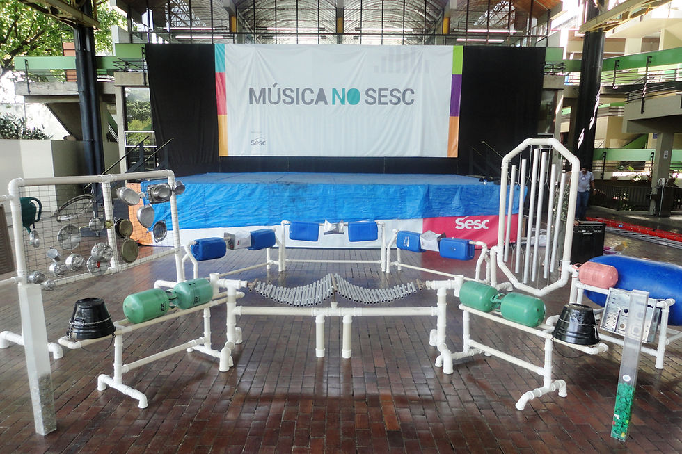 Uma exposição única e itinerante criada para experiências artísticas interativas, intuitivas e ecológicas. Neste cenário desmontável, os instrumentos são grandes brinquedos rítmicos e melódicos, frutos de uma alquimia da nossa luthiaria sustentável com base na reutilização de sucatas e materiais alternativos em uma obra viva de arte e música. Sejam muito bem vindos!